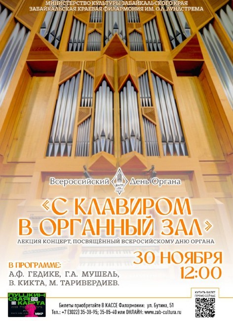 Забайкальская краевая филармония приглашает вас на особое событие, посвящённое Седьмому всероссийскому дню органа. Солистка Забайкальской филармонии Елена Морозова не просто исполнит музыкальные произведения, а приоткроет завесу тайны над «королем инструментов» - расскажет историю возникновения, эволюцию органа. Также зрители увидят как в органной партитуре указываются необходимые органные регистры, и смогут попробовать себя в роли ассистента - самим включать эти регистры. Органная музыка, звучащая под сводами нашей филармонии, по праву считается культурной изюминкой Забайкальского края. Это уникальное явление, которое преображает музыкальное пространство самого восточного уголка России, делая его частью великой органной традиции. Прикоснитесь к величию звука, который вот уже более семи веков волнует умы и сердца.